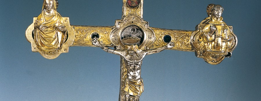 It is a panel-shaped reliquary, with an elaborate silver pedestal surmounted by a panel depicting the Dead Christ supported by an angel, with other scenes from the Passion of Christ at the sides. The work was probably made in the workshop of the Parisian goldsmith Jan du Vivier, commissioned by the King of France, Charles V. The reliquary left the French court and went on to form part of a number of princely collections during the 15th century (such as the collection of Lionello d’Este in Ferrara), before arriving in the Vatican. Here it attracted the attention of Sixtus V, who decided to present it to Montalto delle Marche, his adopted town.