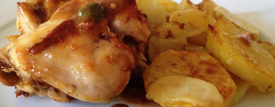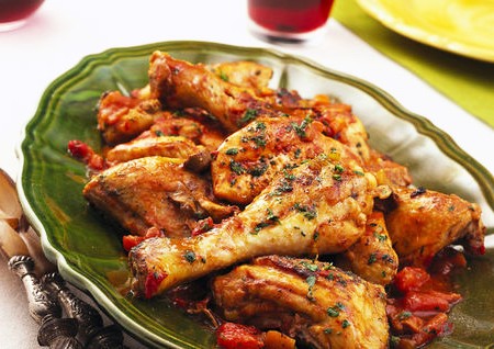 1,2 kg di pollo lavato, nettato e tagliato a pezzi; 4 spicchi d’aglio; 2 pomodori tagliati a pezzetti; 1 rametto di rosmarino; salvia; 1 bicchiere di vino bianco secco; sale e pepe.