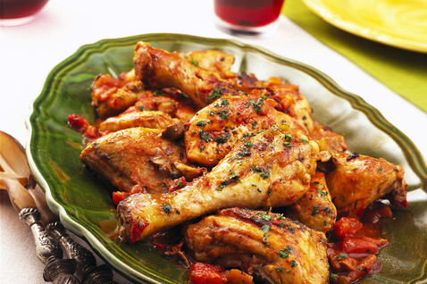 Cuocete il pollo in una casseruola insieme a un po’ d’olio per 30-40 minuti. Versate il vino bianco e lasciate evaporare. Insaporite con il rosmarino, la salvia e l’aglio (con la buccia). Aggiungete sale e pepe e continuate la cottura. Prima di spegnere il fuoco, aggiungete il pomodoro per ammorbidire la carne.