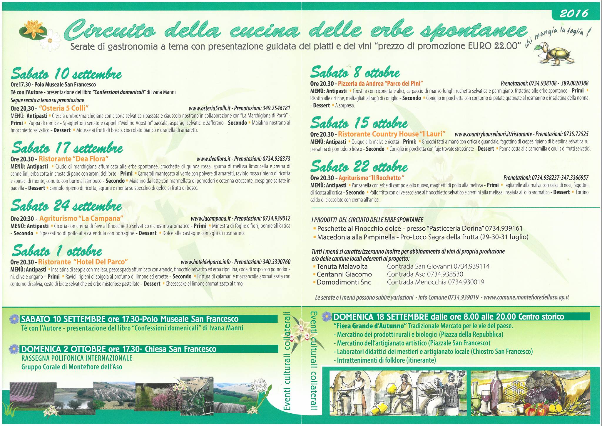 Il progetto del Circuito della Cucina delle erbe spontanee si pone come obiettivo la riscoperta e la conoscenza delle erbe selvatiche, la valorizzazione di questa risorsa naturale, l’approfondimento delle peculiarità gastronomiche delle erbe e la creazione di un circuito di ristoranti che prevedano nel menù piatti con erbe spontanee.