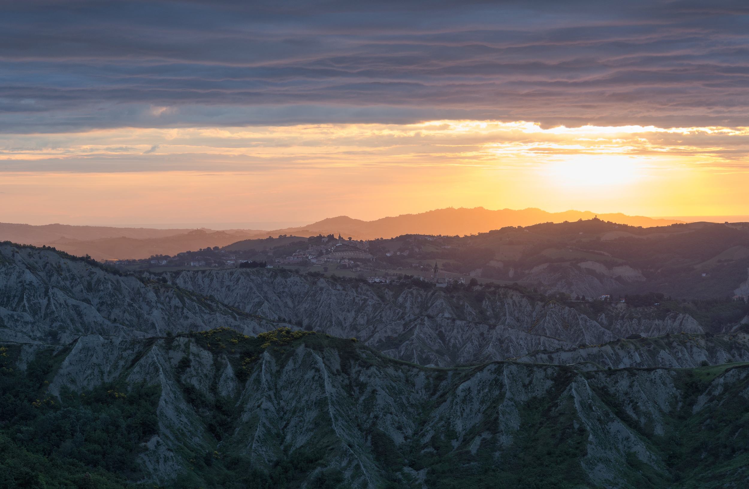 alba sui calanchi del piceno da Polesio: sono visibili Ripaberarda, Castignano e sullo sfondo la costa adriatica