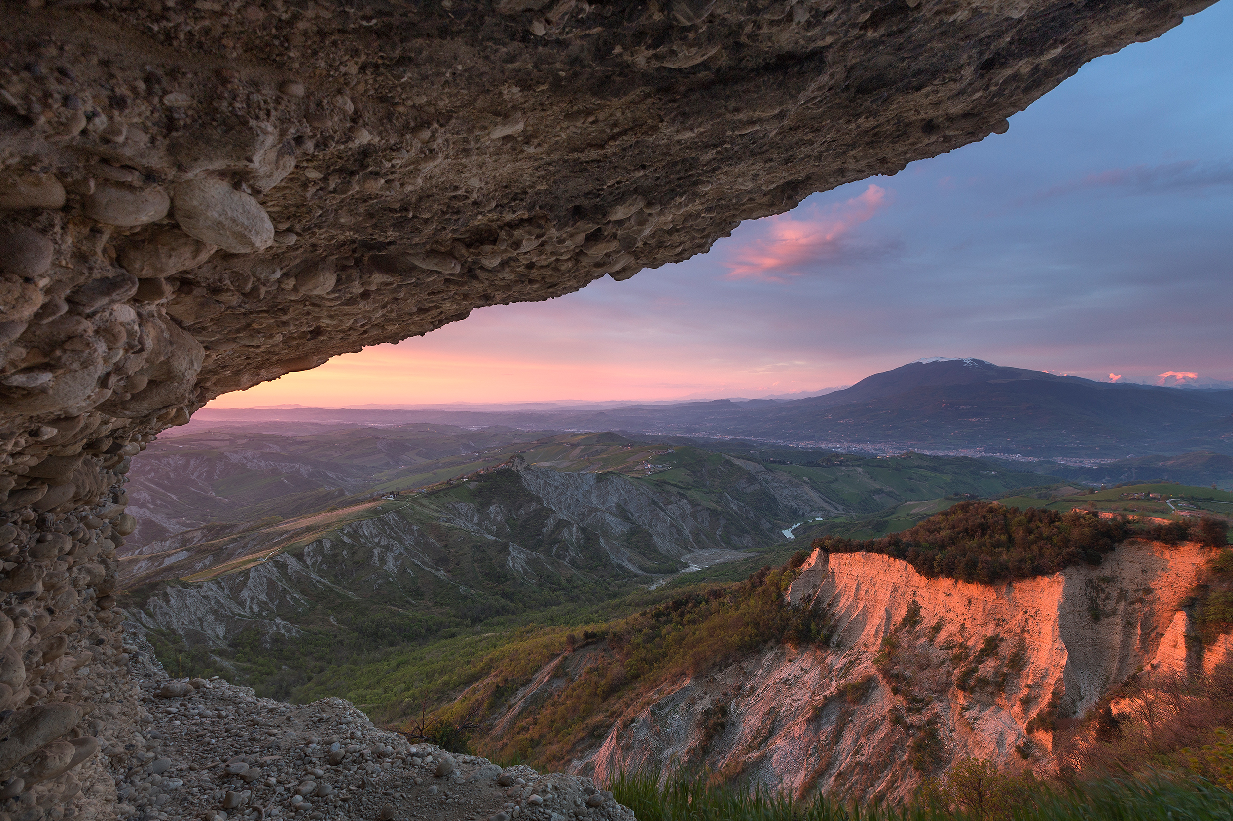 alba da una grotta sul monte dell'Ascensione: in primo piano i calanchi di Porchiano,poi Ascoli,la vallata del Tronto, la montagna dei fiori