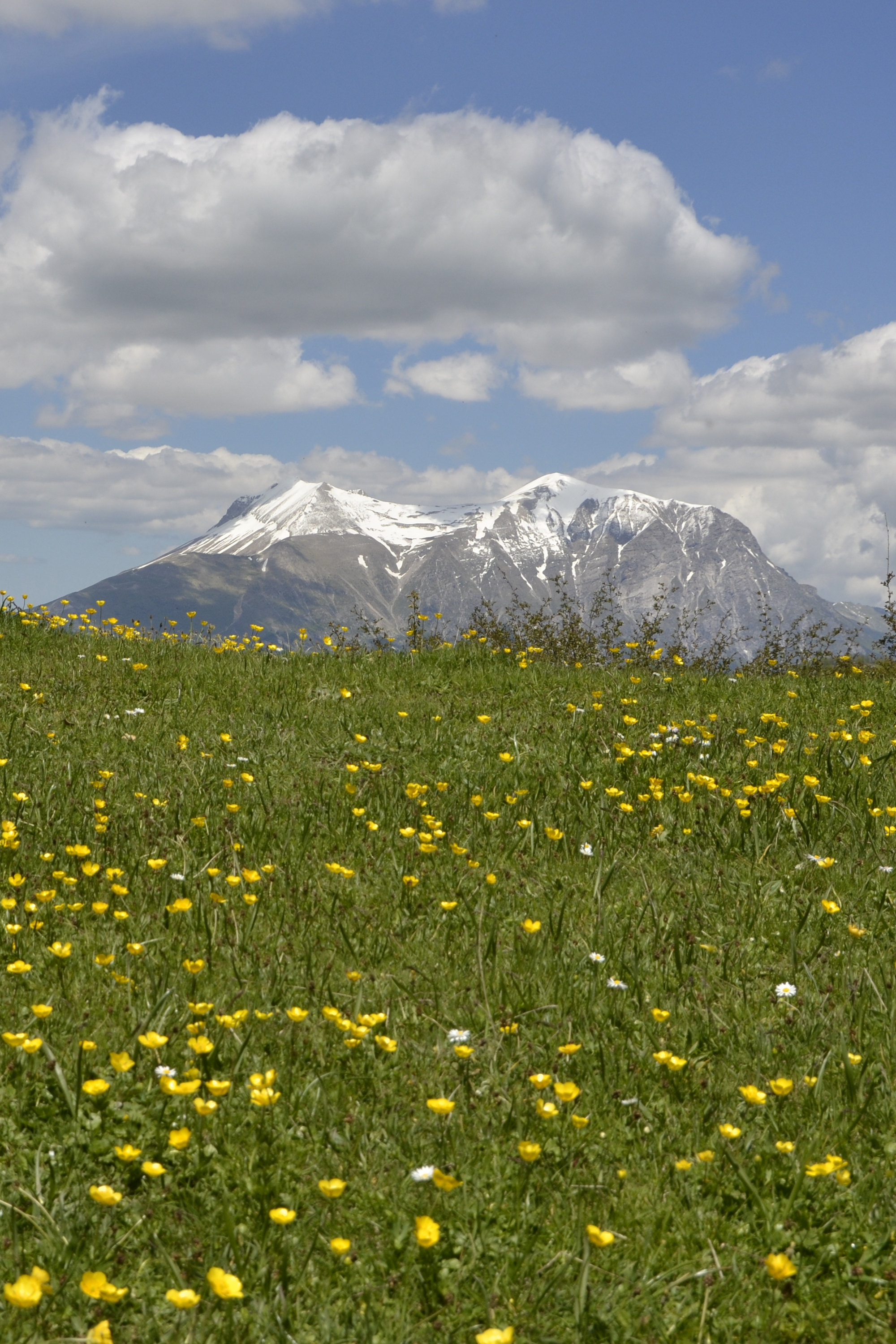 Prato fiorito con sulo sfondo il Vettore ancora con la neve