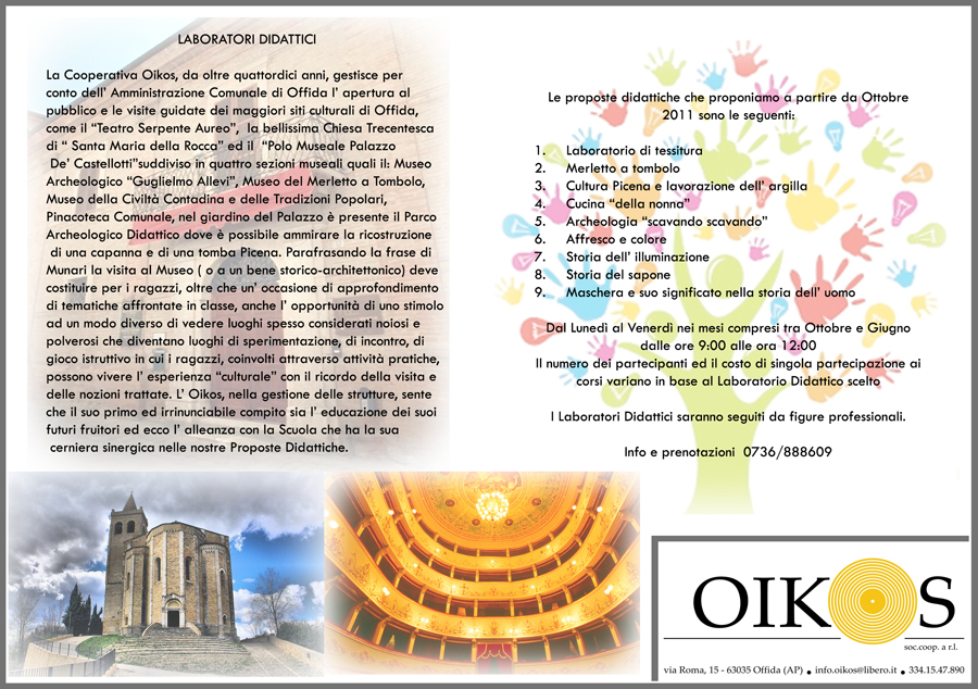 Numerose le proposte didattiche e i relativi laboratori programmati dalla Cooperativa Oikos, come tessitura, merletto a tombolo, lavorazione dell’argilla, cucina, archeologia e affreschi, per dare ai ragazzi l’opportunità di approfondire le tematiche affrontate in classe e per coinvolgerli in attività pratiche e manuali.