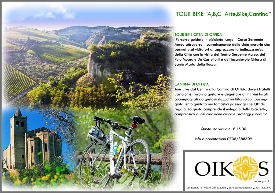 Itinerario artistico-enologico in bicicletta dal centro storico di Offida alla Cantina dei fratelli Bartolomei con degustazioni di ottimi vini piceni.