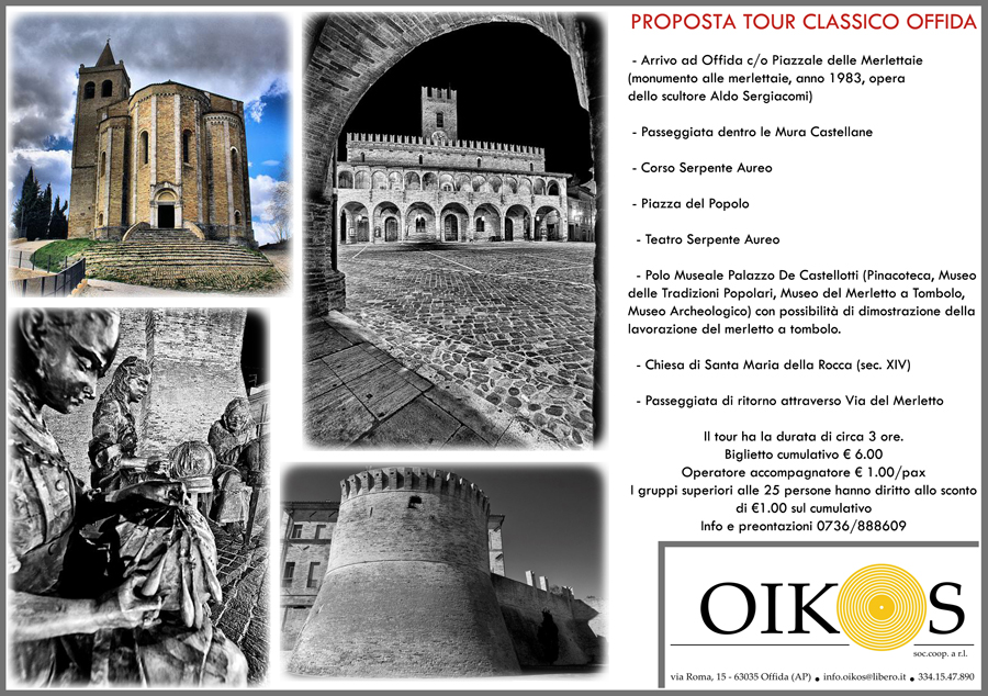 Un itinerario storico-artistico nel centro storico di Offida alla scoperta dei più antichi e significativi monumenti architettonici e culturali della città: si parte dal Piazzale delle Merlettaie, si attraversano poi le Mura Castellane per visitare Piazza del Popolo, il Teatro Serpente Aureo e il Polo Museale. Il tour si conclude infine con la Chiesa di Santa Maria della Rocca.